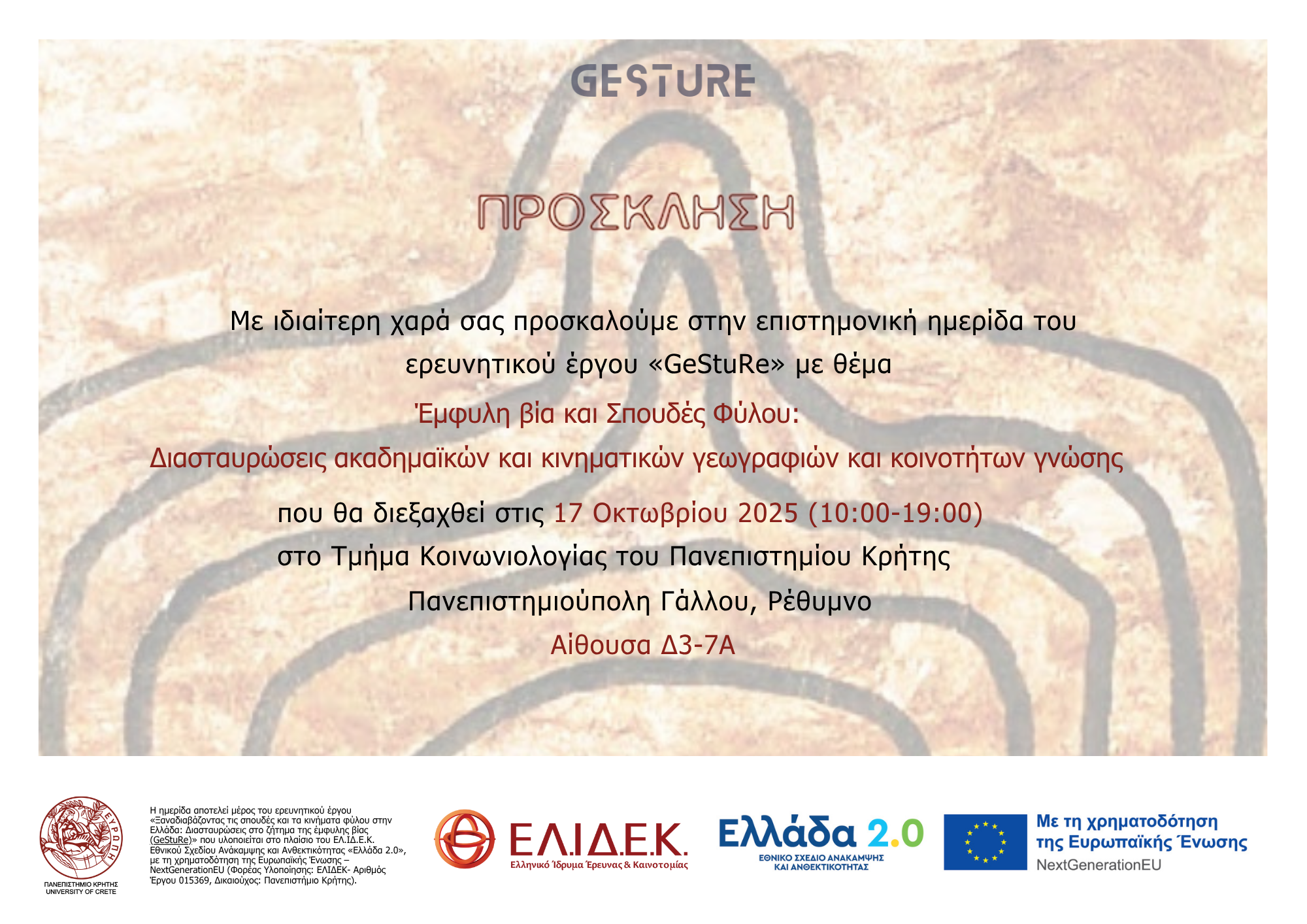 ΘΕΜΑ: ΠΡΟΣΚΛΗΣΗ ΣΕ ΗΜΕΡΙΔΑ Έμφυλη βία και Σπουδές Φύλου: Διασταυρώσεις ακαδημαϊκών και κινηματικών γεωγραφιών και κοινοτήτων γνώσης (17 Οκτωβρίου, Πανεπιστημιούπολη Γάλλου, Ρέθυμνο) ΑΠΟΣΤΟΛΕΑΣ: Alexandra-Evangelia Zavvou <a.zavvou@xxxxxx> Δείτε τα σχετικά αρχεία που βρίσκονται στις παρακάτω υπερ-συνδέσεις : https://news.uoc.gr/news/2025/06-10/ΠΡΟΣΚΛΗΣΗ_ΗΜΕΡΙΔΑΣ_GESTURE.pdf https://news.uoc.gr/news/2025/06-10/ΠΡΟΣΚΛΗΣΗ_ΗΜΕΡΙΔΑΣ_GESTURE.png https://news.uoc.gr/news/2025/06-10/ΑΦΙΣΑ_&_ΠΡΟΓΡΑΜΜΑ_ΗΜΕΡΙΔΑΣ_GESTURE.pdf https://news.uoc.gr/news/2025/06-10/ΑΦΙΣΑ_ΗΜΕΡΙΔΑΣ_GESTURE.pdf Με ιδιαίτερη χαρά σας προσκαλούμε στην Ημερίδα του ερευνητικού έργου GeStuRe με θέμα: Έμφυλη βία και Σπουδές Φύλου: Διασταυρώσεις ακαδημαϊκών και κινηματικών γεωγραφιών και κοινοτήτων γνώσης Ρέθυμνο, 17 Οκτωβρίου 2025 (10:00-19:00) Τμήμα Κοινωνιολογίας, Πανεπιστήμιο Κρήτης Πανεπιστημιούπολη Γάλλου (Αίθουσα Δ3-7Α) Η παρουσία σας θα μας χαροποιήσει και θα μας τιμήσει ιδιαίτερα Η ερευνητική ομάδα του GeStuRe --------------------------------- * Πληροφορίες για το πρόγραμμα της ημερίδας: https://gesture.soc.uoc.gr/publicity-gr/ * Η ημερίδα αποτελεί μέρος του ερευνητικού έργου «Ξαναδιαβάζοντας τις σπουδές και τα κινήματα φύλου στην Ελλάδα: Διασταυρώσεις στο ζήτημα της έμφυλης βίας (GeStuRe)» (https://gesture.soc.uoc.gr) που υλοποιείται στο πλαίσιο του ΕΛ.ΙΔ.Ε.Κ. Εθνικού Σχεδίου Ανάκαμψης και Ανθεκτικότητας «Ελλάδα 2.0», με τη χρηματοδότηση της Ευρωπαϊκής Ένωσης – NextGenerationEU (Φορέας Υλοποίησης: ΕΛΙΔΕΚ - Αριθμός Έργου 015369, Δικαιούχος: Πανεπιστήμιο Κρήτης). -- Αλεξάνδρα Ζαββού |