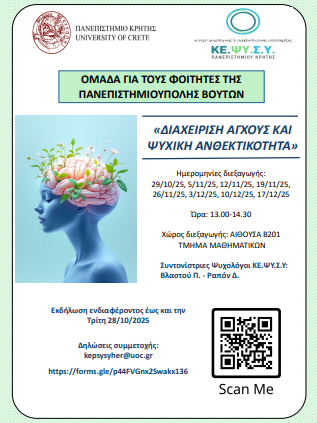 ΘΕΜΑ: "Διαχείριση Άγχους και Ψυχική Ανθεκτικότητα" ΑΠΟΣΤΟΛΕΑΣ: Καλλιόπη Βλαστού <k.vlastou@xxxxxx> Παρακαλούμε δείτε το σχετικό αρχείο: https://news.uoc.gr/news/2025/21-10/ΔΙΑΧΕΙΡΙΣΗ_ΑΓΧΟΥΣ_ΚΑΙ_ΨΥΧΙΚΗ_ΑΝΘΕΚΤΙΚΟΤΗΤΑ.pdf Το Κέντρο Ψυχολογικής & Συμβουλευτικής Υποστήριξης διοργανώνει ομάδα για τους φοιτητές του Πανεπιστημίου Κρήτης στο Ηράκλειο με θέμα "Διαχείριση Άγχους και Ψυχική Ανθεκτικότητα". Ημερομηνίες διεξαγωγής: 29/10/25, 5/11/25, 12/11/25, 19/11/25, 26/11/25, 3/12/25, 10/12/25, 17/12/25 και ώρα 13:00 - 14:30 Χώρος διεξαγωγής: ΑΙΘΟΥΣΑ Β201 ΤΜΗΜΑ ΜΑΘΗΜΑΤΙΚΩΝ Συντονίστριες Ψυχολόγοι ΚΕ.ΨΥ.Σ.Υ: Βλαστού Π. - Ραπόν Δ. Υποβολή αιτήσεων: https://forms.gle/p44FVGnx2Swakx136 Προθεσμία εκδήλωσης ενδιαφέροντος έως και την Τρίτη 28/10/2025 |