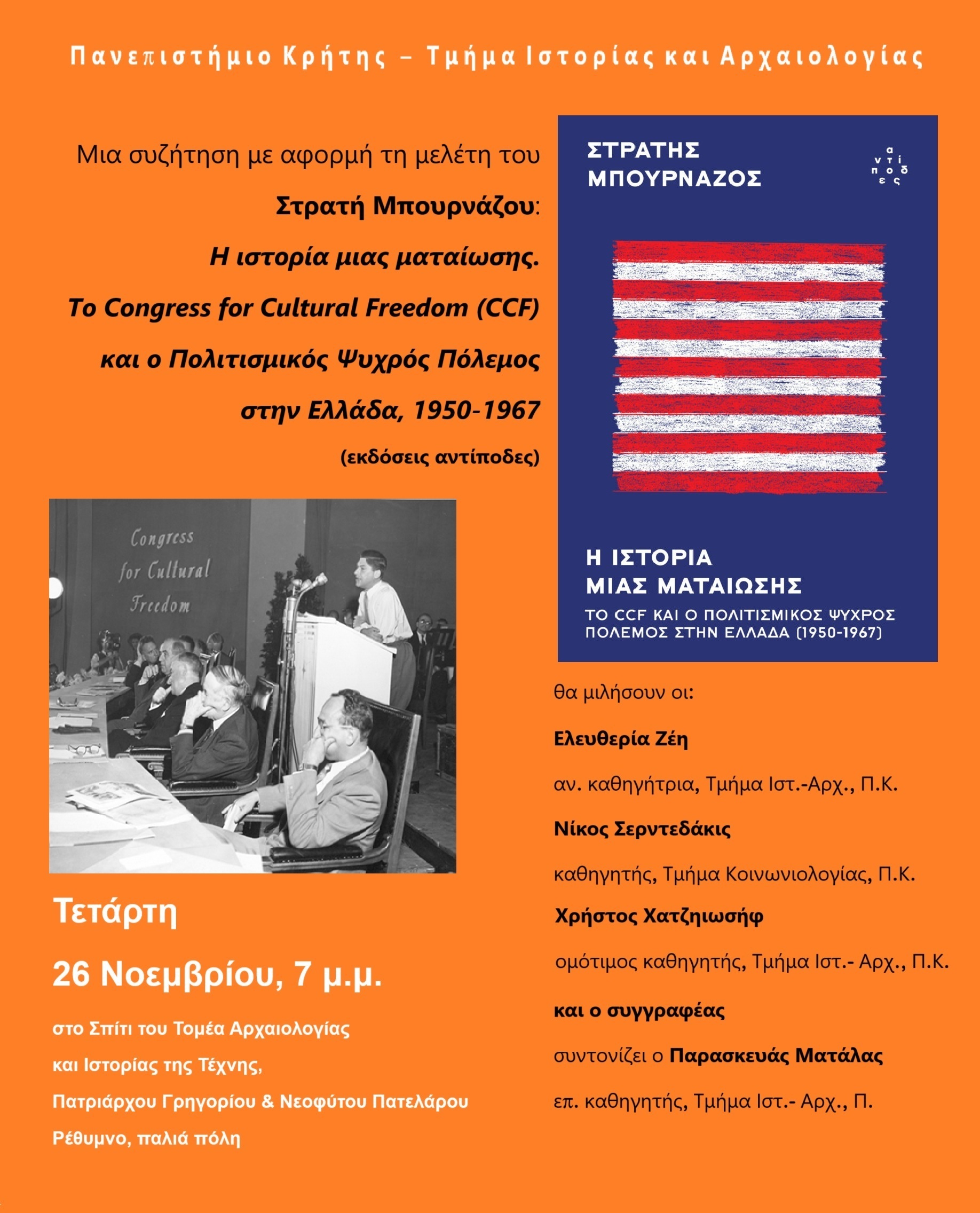 ΘΕΜΑ: Συζήτηση με αφορμή τη μελέτη του Στρατή Μπουρνάζου: «Η ιστορία μιας ματαίωσης. Το Congress for Cultural Freedom (CCF) και ο Πολιτισμικός Ψυχρός Πόλεμος στην Ελλάδα, 1950-1967» | 26/11/25, 19:00 @ Σπίτι Τομέα Αρχαιολογίας & Ιστορίας της Τέχνης, Ρέθυμν ΑΠΟΣΤΟΛΕΑΣ: Γραμματεία Τμ. Ιστορίας & Αρχαιολογίας, Παν. Κρήτης- Secretary of Dpt of History & Archaeology - Univ. of Crete history-archaeology@xxxxxxxxx Παρακαλούμε δείτε το σχετικό αρχείο: https://news.uoc.gr/news/2025/24-11/Μπουρνάζος-αφίσα.jpg Το Τμήμα Ιστορίας και Αρχαιολογίας του Πανεπιστημίου Κρήτης σας καλεί σε μια συζήτηση με αφορμή τη μελέτη του Στρατή Μπουρνάζου: «Η ιστορία μιας ματαίωσης. Το Congress for Cultural Freedom (CCF) και ο Πολιτισμικός Ψυχρός Πόλεμος στην Ελλάδα, 1950-1967» που κυκλοφόρησε από τις εκδόσεις Αντίποδες το 2024. Θα συμμετάσχουν οι: Ελευθερία Ζέη (αν. καθηγήτρια, πρόεδρος του Τμήματος Ιστ.-Αρχ. Π.Κ), Νίκος Σερντεδάκις (καθηγητής, Τμήμα Κοινωνιολογίας, Π.Κ.), Χρήστος Χατζηιωσήφ (ομότιμος καθηγητής, Τμήμα Ιστ.- Αρχ., Π.Κ) και ο συγγραφέας. Θα συντονίσει ο Παρασκευάς Ματάλας (επ. καθηγητής, Τμήμα Ιστ.- Αρχ., Π.Κ.). Τετάρτη, 26 Νοεμβρίου, 7 μ.μ. στο Σπίτι του Τομέα Αρχαιολογίας και Ιστορίας της Τέχνης, Πατριάρχου Γρηγορίου & Νεοφύτου Πατελάρου, Ρέθυμνο, παλιά πόλη. -- Προϊσταμένη Γραμματείας: Σταυρούλα Κρητικάκη / Head Secretary: Stavroula Kritikaki |
