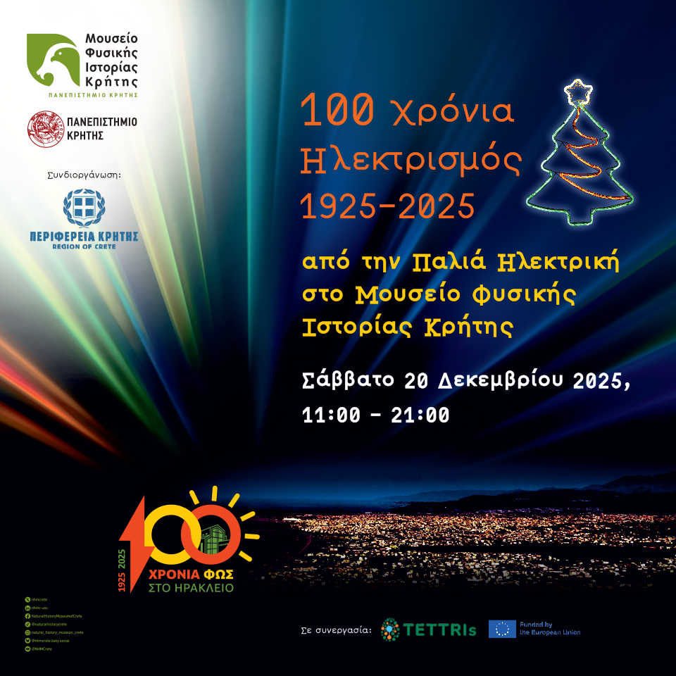 Η Περιφέρεια Κρήτης και ο Σύλλογος Φίλοι του Μουσείου Φυσικής Ιστορίας γιορτάζουν την επέτειο των 100 χρόνων από τον εξηλεκτρισμό της πόλης του Ηρακλείου στο Μουσείο Φυσικής Ιστορίας Κρήτης, το Σάββατο 20 Δεκεμβρίου 2025, από τις11:00 το πρωί μέχρι τις 21:00 το βράδυ, με ελεύθερη είσοδο για το κοινό!