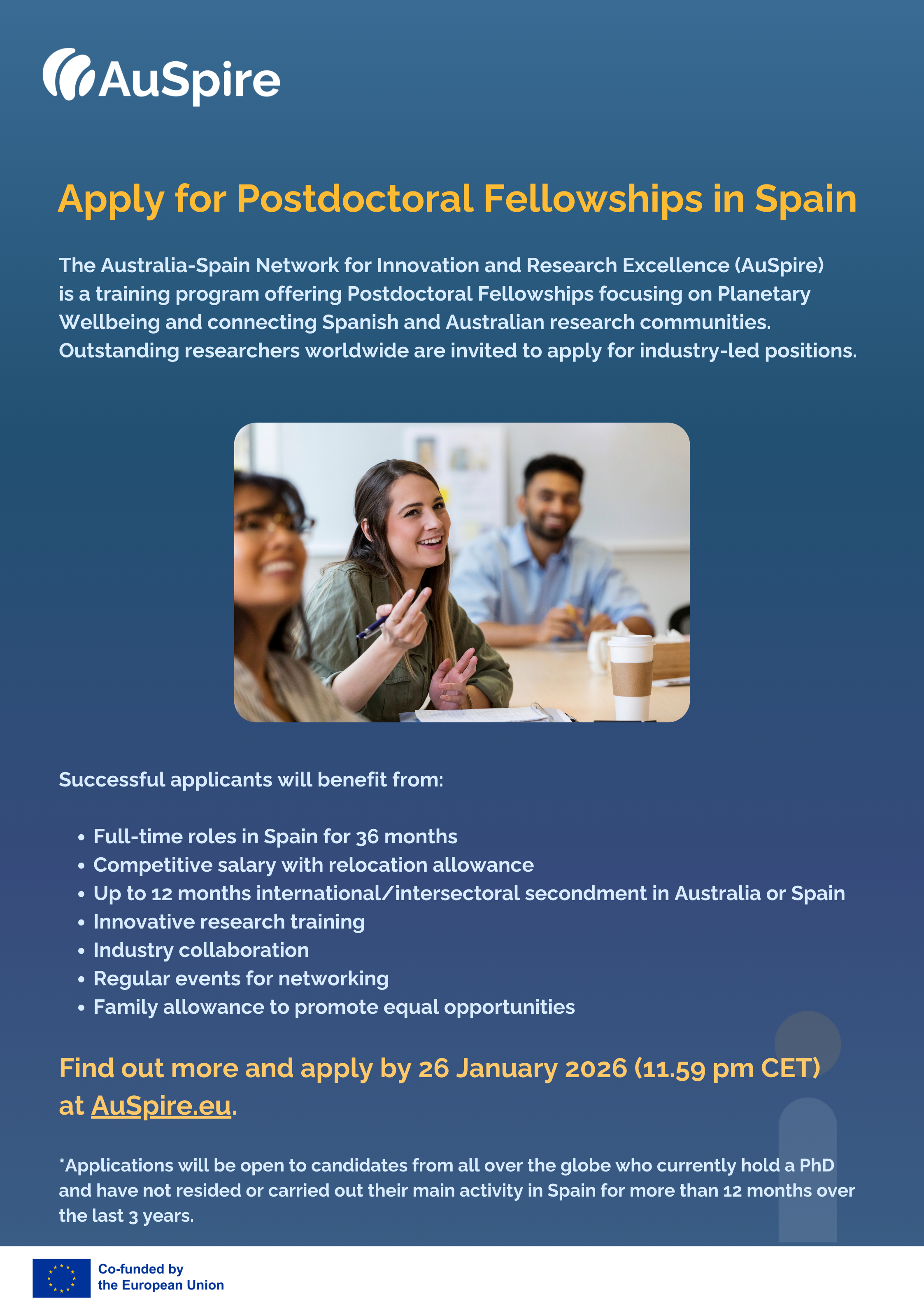 ΘΕΜΑ: Postdoctoral Fellowships in Spain, with funded secondments to Australia ΑΠΟΣΤΟΛΕΑΣ: inpubrel <inpubrel@xxxxxx> Παρακαλούμε δείτε το σχετικό αρχείο: https://news.uoc.gr/news/2026/12-01/AuSpire_call_2_poster_1.png Dear Sir or Madam, I am contacting you on behalf of RMIT Europe to share and request your assistance in disseminating the second call of our postdoctoral program, which offers positions in Spain and secondments in Australia. We would greatly appreciate if you could share it through your channels. Below, I provide more information and attach some visuals. Postdoctoral Fellowships in Spain, with funded secondments to Australia The Australia-Spain Network for Innovation and Research Excellence (AuSpire) program is a postdoctoral training initiative co-funded by the European Union (Marie Skłodowska-Curie Actions). Coordinated by RMIT Europe, AuSpire brings together leading supervisors from 23 research centres, companies, and universities. AuSpire offers Postdoctoral Fellowships to train researchers in Comparative Genomics, Computational Materials Science, Underwater Laser Communication, Nature-based Wastewater Treatment Systems, Nanotechnologies, Mental Health Ecosystems Design and Management, and other related fields, with a focus on Planetary Wellbeing. Benefits of joining the AuSpire Program include: · Full-time employment in Spain for 36 months (3 years) with excellent conditions · A competitive salary, including a relocation mobility allowance · Up to 12 months international/intersectoral secondment in Australia or Spain · Participation in an international research environment centred on Planetary Wellbeing · An innovative research training program · Collaboration with industry leaders · Attendance at events to build a sustainable research community and foster collaboration · Engagement in innovative projects with significant societal and commercial value · Family allowances to ensure equal opportunities for postdoctoral fellows with families We are looking for outstanding researchers from around the world who have not resided or carried out their main activity in Spain for more than 12 months in the past 3 years and who hold a PhD. Successful applicants are expected to start in June 2026. The call for applications is open from 1 December 2025 until 26 January 2026. For more information, please visit our website: auspire.eu, and connect with us on LinkedIn, Facebook and Instagram. We encourage you to share this information with your networks. Kind regards,