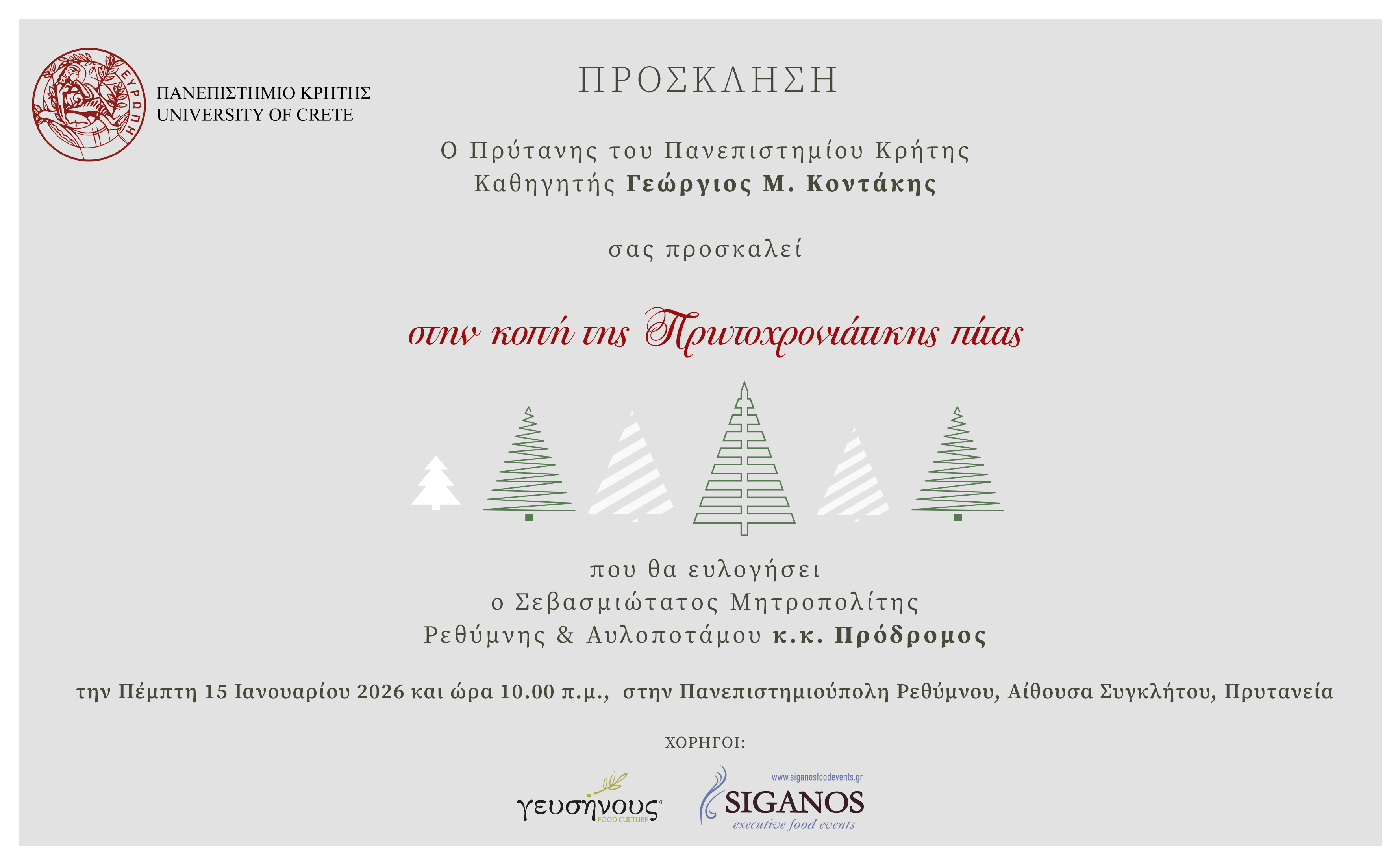 ΘΕΜΑ: ΕΥΓΕΝΙΚΗ ΥΠΕΝΘΥΜΙΣΗ - ΠΡΟΣΚΛΗΣΗ ΓΙΑ ΚΟΠΗ ΠΡΩΤΟΧΡΟΝΙΑΤΙΚΗΣ ΠΙΤΑΣ ΣΤΟ ΠΑΝΕΠΙΣΤΗΜΙΟ ΚΡΗΤΗΣ ΣΤΟ ΡΕΘΥΜΝΟ 15-1-2026 ώρα 10.00π.μ. ΑΠΟΣΤΟΛΕΑΣ: Δαφέρμου Ρένα <dafermoy@xxxxxxxxxxxx> Παρακαλούμε δείτε το σχετικό αρχείο: https://news.uoc.gr/news/2026/15-01/Πρόσκληση_ΚΟΠΗ_ΠΙΤΑΣ_2026.png Αξιότιμες κυρίες, αξιότιμοι κύριοι, Ο Πρύτανης του Πανεπιστημίου Κρήτης Καθηγητής Γεώργιος Μ. Κοντάκης, σας προσκαλεί στην κοπή της Πρωτοχρονιάτικης πίτας, η οποία θα πραγματοποιηθεί σήμερα 15-1-2026 στις 10.00 π.μ. στην αίθουσα Συγκλήτου στην Πανεπιστημιούπολη Γάλλου στο Ρέθυμνο. |