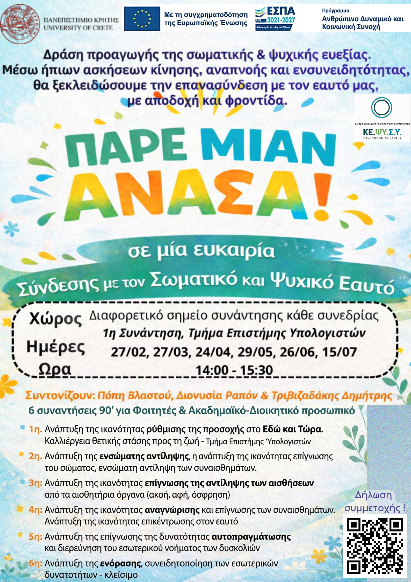 ΘΕΜΑ: Ορθή επανάληψη: Δράση: Πάρε μιαν Ανάσα" - ΚΕ.ΨΥ.Σ.Υ. Πανεπιστημιούπολης Βουτών ΑΠΟΣΤΟΛΕΑΣ: Κέντρο Ψυχολογικής & Συμβουλευτικής Υποστήριξης Παρακαλούμε δείτε το σχετικό αρχείο: https://news.uoc.gr/news/2026/25-02/ΠΑΡΕ_ΜΙΑΝ_ΑΝΑΣΑ_αφίσα.png ΟΡΘΗ ΕΠΑΝΑΛΗΨΗ: Διόρθωση QR ΑΦΙΣΑΣ ΠΑΡΕ ΜΙΑΝ ΑΝΑΣΑ ΣΥΝΤΟΝΙΖΟΥΝ: Πόπη Βλαστού, Διονυσία Ραπόν, Τριβιζαδάκης Δημήτρης Διάρκεια: 6 συναντήσεις 90 λεπτών Πληθυσμός- στόχος: Ακαδημαϊκό, διοικητικό προσωπικό και φοιτητές του ΠΚ Ημερομηνίες διεξαγωγής: 27/2, 27/3, 24/4, 29/5, 26/6, 15/7 Ώρα διεξαγωγής: 14.00-15.30 Χώρος διεξαγωγής: Διαδφορετικό σημείο συνάντησης κάθε συνεδρίας Η δράση αποτελεί μία βιωματική ομάδα με στόχο την προαγωγή της συναισθηματικής αυτορρύθμισης, της σωματικής ευεξίας και της σύνδεσης των συμμετεχόντων με τον εαυτό τους και την πανεπιστημιακή κοινότητα. Συνδυάζει στοιχεία mindfulness, gestalt και ειδικό ασκησιολόγιο μυϊκής αποφόρτισης. Ειδικοί στόχοι: 1η συνάντηση: Ανάπτυξη της ικανότητας ρύθμισης της προσοχής στο Εδώ και Τώρα και καλλιέργεια θετικής στάσης προς τη ζωή 2η συνάντηση: ανάπτυξη της ενσώματης αντίληψης, η ανάπτυξη της ικανότητας επίγνωσης του σώματος, ενσώματη αντίληψη των συναισθημάτων 3η συνάντηση: Ανάπτυξη της ικανότητας επίγνωσης της αντίληψης των αισθήσεων από τα αισθητήρια όργανα (ακοή, αφή, όσφρηση) 4η συνάντηση: Ανάπτυξη της ικανότητας αναγνώρισης και επίγνωσης των συναισθημάτων- ανάπτυξη της ικανότητας επικέντρωσης στον εαυτό. 5η συνάντηση: Ανάπτυξη της επίγνωσης της δυνατότητας αυτοπραγμάτωσης και διερεύνηση του εσωτερικού νοήματος και των δυσκολιών 6η συνάντηση: Ανάπτυξη της ενόρασης, συνειδητοποίηση των εσωτερικών δυνατοτήτων -κλείσιμο Φόρμα υποβολής αιτήματος: https://docs.google.com/forms/d/e/1FAIpQLSd-42JK28xiEEYHA9iDqBR_gJLBSzgCAhhQU-pAj67mP9ga_Q/viewform Βεβαιώσεις συμμετοχής θα δοθούν κατόπιν παρακολούθησης των συναντήσεων της ομάδας, σε όσους/ες το επιθυμούν. -- Κέντρο Ψυχολογικής & Συμβουλευτικής Υποστήριξης Πανεπιστημίου Κρήτης (ΚΕ.ΨΥ.Σ.Υ.) Πανεπιστημιούπολη Βουτών, Ηράκλειο Τηλ.: 2810 394885 Email: kepsysyher@uoc.gr ------------------------------------ Psychological and Counseling Support Center University of Crete Voutes Campus, Heraklion Tel. (0030) 2810 394885 Email: kepsysyher@xxxxxx ΠΡΟΕΙΔΟΠΟΙΗΣΗ ΕΜΠΙΣΤΕΥΤΙΚΟΤΗΤΑΣ – ΑΠΟΠΟΙΗΣΗ ΕΥΘΥΝΗΣ Αυτό το μήνυμα ηλεκτρονικού ταχυδρομείου καθώς και όλα τα αρχεία τα συνημμένα σε αυτό, περιέχουν πληροφορίες αποκλειστικά προς χρήση από τον σκοπούμενο παραλήπτη και περιέχουν εμπιστευτικές και ιδιωτικές πληροφορίες. Εάν ο λήπτης του παρόντος μηνύματος δεν είναι ο σκοπούμενος παραλήπτης ή ο εξουσιοδοτημένος υπάλληλος ή αντιπρόσωπος προς παράδοση αυτού στον σκοπούμενο παραλήπτη, απαγορεύεται αυστηρώς κάθε διάδοση, αποκάλυψη, διαβίβαση, αντιγραφή, εκτύπωση ή άλλη χρήση καθώς και οποιαδήποτε ενέργεια ή παράλειψη αναφορικά με τις πληροφορίες που εμπεριέχονται στο παρόν, άλλως η ευθύνη βαραίνει το μη εξουσιοδοτημένο άτομο που προέβη στις παραπάνω παράνομες ενέργειες. Το Π.Κ. δεν ευθύνεται για οποιαδήποτε απώλεια, επιπλοκή ή ζημιά σε δεδομένα ή υπολογιστικά συστήματά σας που ενδεχομένως προκύψουν από τη χρήση δεδομένων που περιλαμβάνονται στο παρόν μήνυμα ή διαβιβάζονται εξ αιτίας ή εξ αφορμής του παρόντος. Εάν λάβατε το παρόν μήνυμα εκ παραδρομής παρακαλείσθε να ενημερώσετε άμεσα τον αποστολέα απαντώντας με μήνυμα ηλεκτρονικού ταχυδρομείου στο παρόν και εν συνεχεία να διαγράψετε το παρόν μήνυμα καθώς και όλο το συνημμένο σε αυτό υλικό από κάθε σύστημα ή υπολογιστή σας. Δη