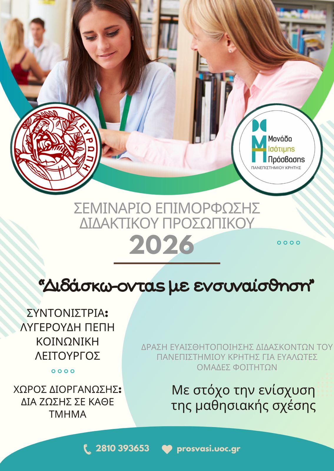 "Η Μονάδα Ισότιμης Πρόσβασης - Μ.Ι.Π. -  του Πανεπιστημίου Κρήτης διοργανώνει σεμινάριο επιμόρφωσης διδακτικού προσωπικού με τίτλο: