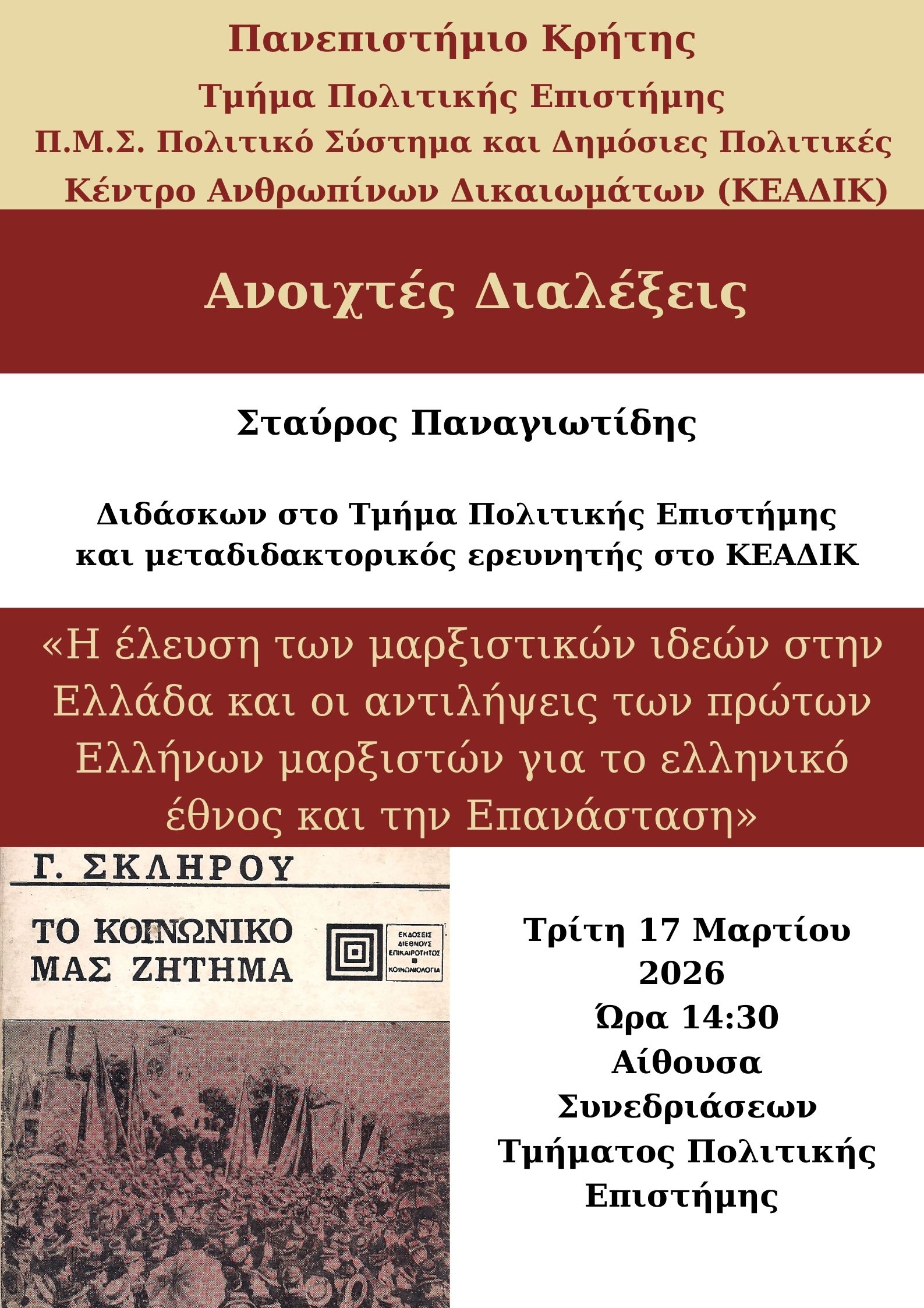 ΘΕΜΑ: Πανεπιστήμιο Κρήτης - Τμήμα Πολιτικής Επιστήμης- Ανοιχτές Διαλέξεις ΑΠΟΣΤΟΛΕΑΣ: Pelagia Tsakiraki <tsakiraki@xxxxxx> Παρακαλούμε δείτε το σχετικό αρχείο: https://news.uoc.gr/news/2026/16-03/3_Κέντρο_Ανθρωπίνων_Δικαιωμάτων_(ΚΕΑΔΙΚ).pdf Πανεπιστήμιο Κρήτης Τμήμα Πολιτικής Επιστήμης Π.Μ.Σ. Πολιτικό Σύστημα και Δημόσιες Πολιτικές, Κέντρο Ανθρωπίνων Δικαιωμάτων (ΚΕΑΔΙΚ) Ανοιχτές Διαλέξεις Σταύρος Παναγιωτίδης Διδάσκων στο Τμήμα Πολιτικής Επιστήμης και μεταδιδακτορικός ερευνητής στο ΚΕΑΔΙΚ «Η έλευση των μαρξιστικών ιδεών στην Ελλάδα και οι αντιλήψεις των πρώτων Ελλήνων μαρξιστών για το ελληνικό έθνος και την Επανάσταση» Τρίτη, 17 Μαρτίου 2026, Αίθουσα Συνεδριάσεων Τμήματος Πολιτικής Επιστήμης, ώρα: 14.30
