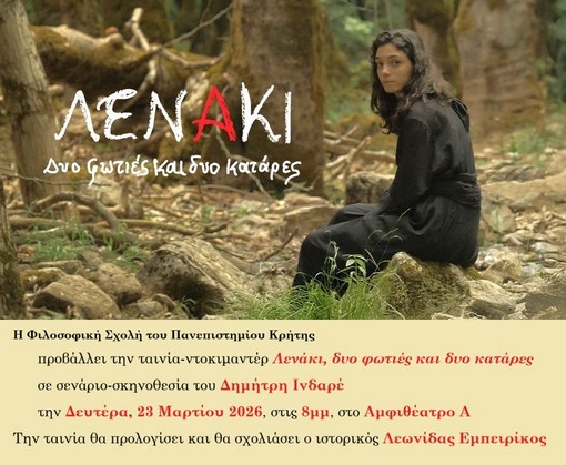 Η Φιλοσοφική Σχολή του Πανεπιστημίου Κρήτης προβάλλει την ταινία-ντοκιμαντέρ «Λενάκι, δυο φωτιές και δυο κατάρες» (2024, 72'), σε σενάριο-σκηνοθεσία του Δημήτρη Ινδαρέ, την Δευτέρα 23 Μαρτίου 2026, στις 8μμ, στο Αμφιθέατρο Α.