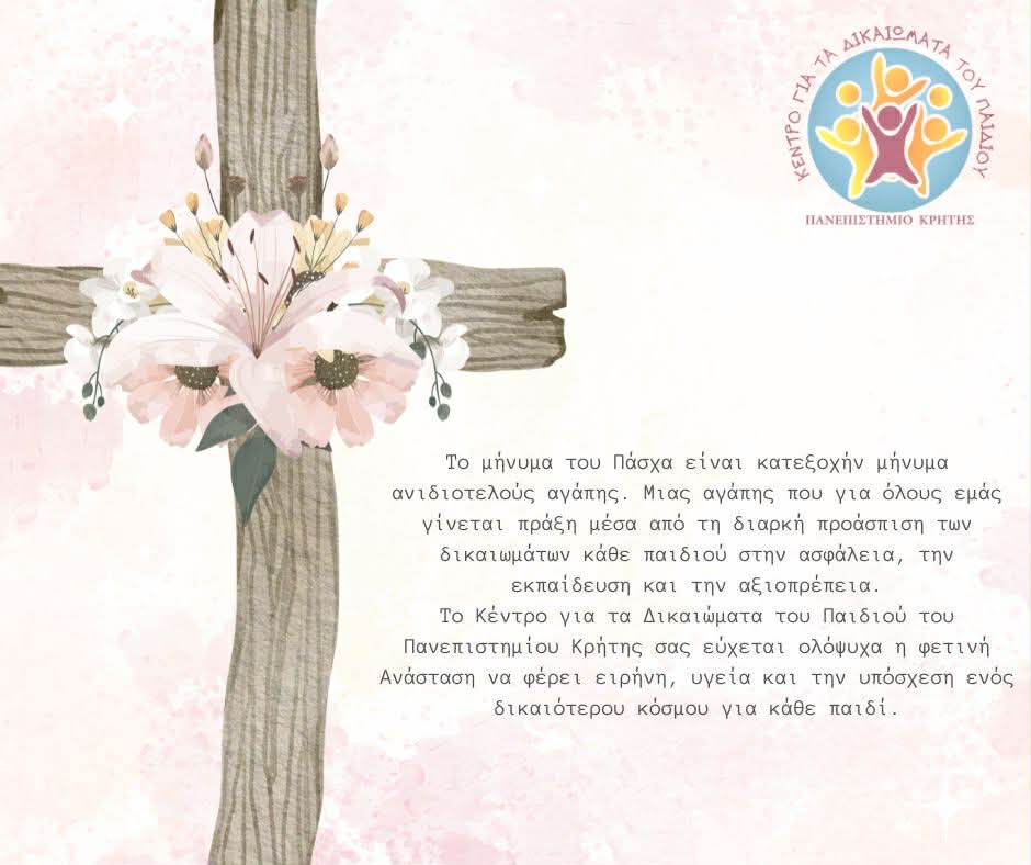 ΘΕΜΑ: ΠΑΣΧΑΛΙΝΕΣ ΕΥΧΕΣ ΑΠΟ ΤΟ ΚΕΝΤΡΟ ΓΙΑ ΤΑ ΔΙΚΑΙΩΜΑΤΑ ΤΟΥ ΠΑΙΔΙΟΥ ΤΟΥ ΠΑΝΕΠΙΣΤΗΜΙΟΥ ΚΡΗΤΗΣ