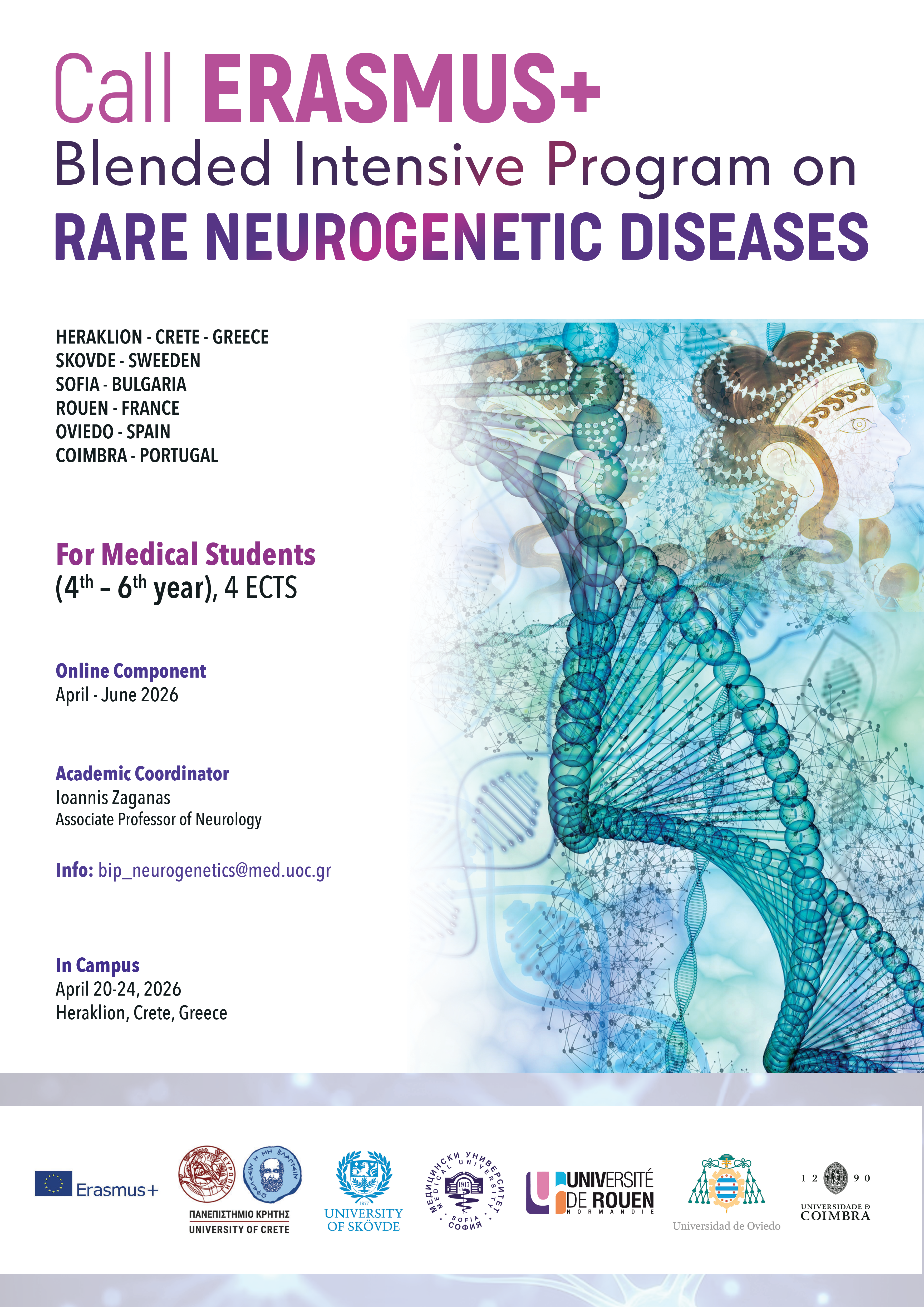 ΘΕΜΑ: BIP "Rare Neurogenetic Diseases" 20-24/4/2026 ΑΠΟΣΤΟΛΕΑΣ: Antonia Tzanaki tzanakit@xxxxxx Παρακαλούμε δείτε το σχετικό αρχείο: https://news.uoc.gr/news/2026/07-04/Rare_Neurogenetic_Diseases_posterfnl.png Με χαρά σας ενημερώνουμε ότι στις 20–24 Απριλίου 2026 διεξάγεται στην Ιατρική Σχολή του Πανεπιστημίου Κρήτης το ERASMUS+ Blended Intensive Programme (BIP) για τις Σπάνιες Νευρογενετικές Παθήσεις — μια δυναμική συνεργασία, υπό τον ακαδημαϊκό συντονισμό του Καθηγητή κ. Ιωάννη Ζαγανά, που φέρνει κοντά κορυφαία ευρωπαϊκά πανεπιστήμια από Ελλάδα, Σουηδία, Βουλγαρία, Γαλλία, Ισπανία και Πορτογαλία. Το πρόγραμμα προσφέρει μια μοναδική ευκαιρία για εμβάθυνση σε σύγχρονα θέματα νευρογενετικής μέσα σε ένα διεθνές και διεπιστημονικό περιβάλλον. Antonia Tzanaki MSc, MA Acting Head of International & Public Relations Dpt. UNIVERSITY OF CRETE Voutes Campus, 70013 Heraklion tel: ++30 2810 393446 |