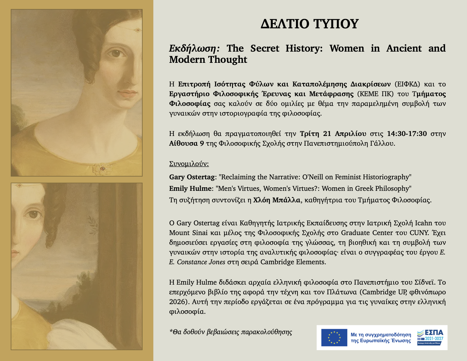 ΘΕΜΑ: Εκδήλωση: The Secret History: Women in Ancient and Modern Thought ΑΠΟΣΤΟΛΕΑΣ: Yvonne - Alexia Kosma <yvonnekosma@xxxxxx> Δείτε τα σχετικά αρχεία που βρίσκονται στις παρακάτω υπερ-συνδέσεις : https://news.uoc.gr/news/2026/17-04/Δελτίο_Τύπου_(The_Secret_History).png Η Επιτροπή Ισότητας Φύλων και Καταπολέμησης Διακρίσεων (ΕΙΦΚΔ) και το Εργαστήριο Φιλοσοφικής Έρευνας και Μετάφρασης (ΚΕΜΕ ΠΚ) του Τμήματος Φιλοσοφίας σας καλούν σε δύο ομιλίες με θέμα την παραμελημένη συμβολή των γυναικών στην ιστοριογραφία της φιλοσοφίας. Συνομιλούν: Gary Ostertag: "Reclaiming the Narrative: O'Neill on Feminist Historiography" Emily Hulme: "Men's Virtues, Women's Virtues?: Women in Greek Philosophy" Τη συζήτηση συντονίζει η Χλόη Μπάλλα, καθηγήτρια του Τμήματος Φιλοσοφίας. Η Πρόεδρος της ΕΙΦΚΔ -- -- |