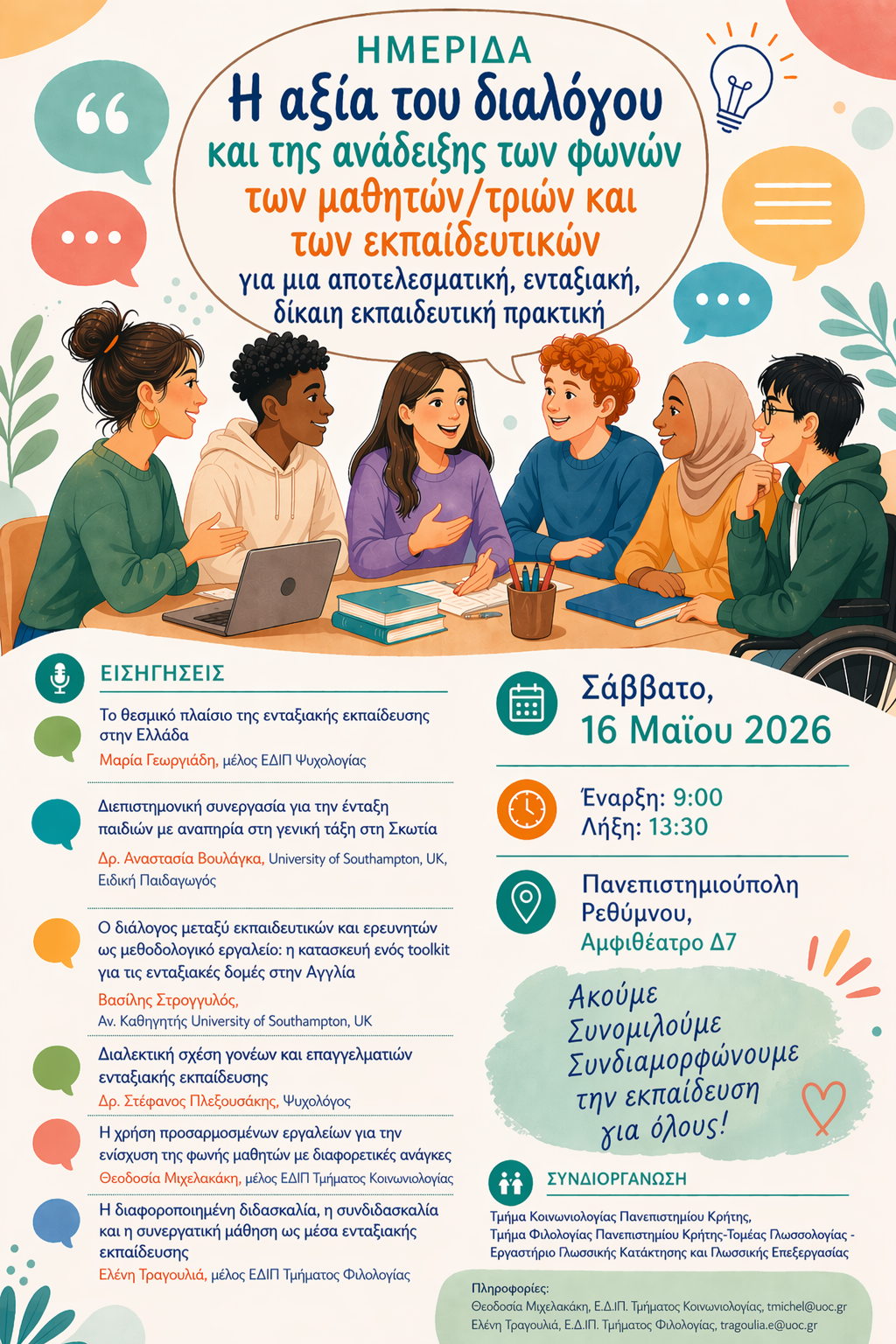 Ημερίδα με θέμα «Η αξία του διαλόγου και της ανάδειξης των φωνών των μαθητών/τριών και των εκπαιδευτικών για μια αποτελεσματική, ενταξιακή και δίκαιη εκπαιδευτική πρακτική».