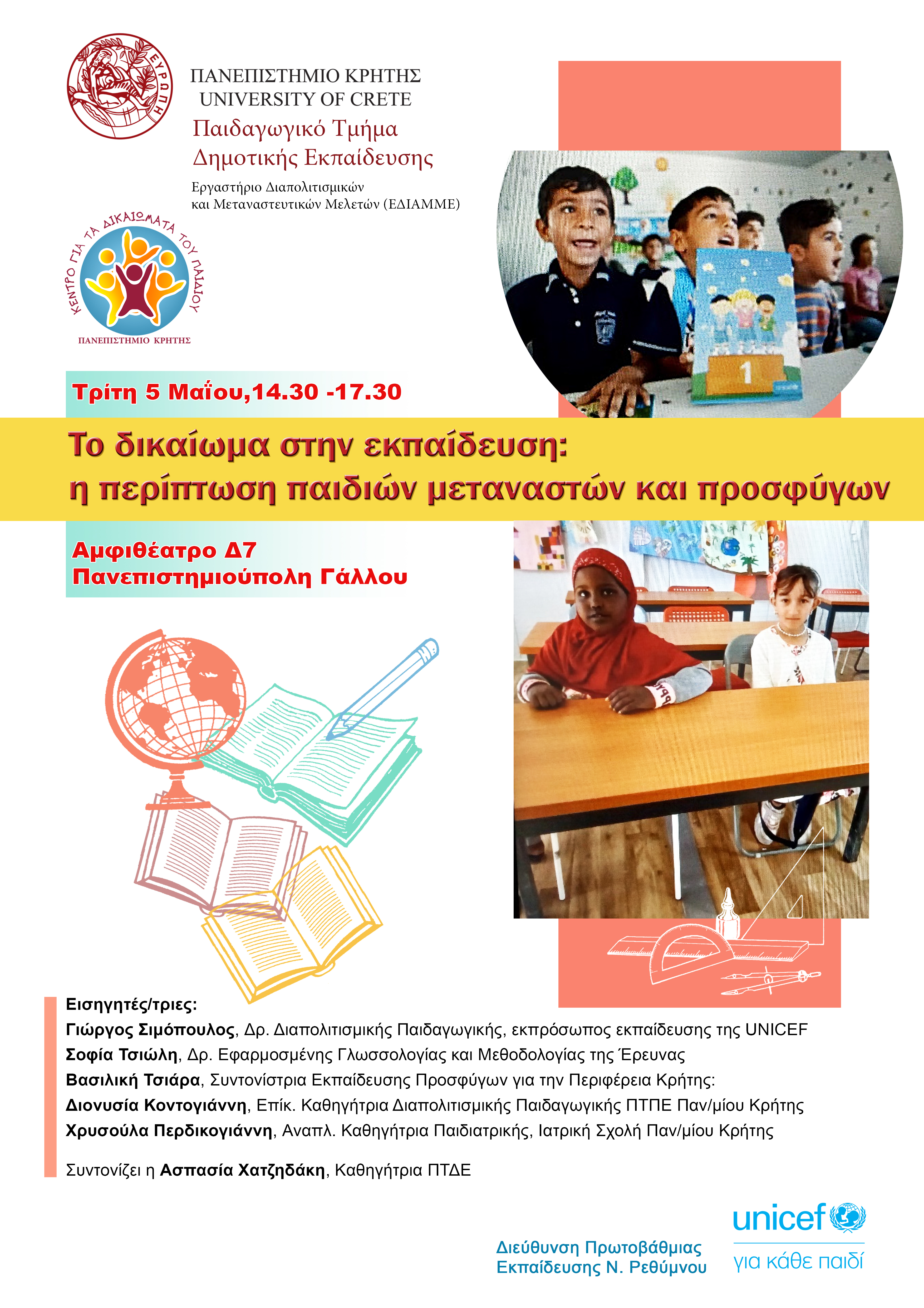 ΘΕΜΑ: Ημερίδα: «To Δικαίωμα στην Εκπαίδευση: η Περίπτωση Παιδιών Μεταναστών και Προσφύγων ΑΠΟΣΤΟΛΕΑΣ: Petraki Kyriaki petrakik@xxxxxx Δείτε τα σχετικά αρχεία που βρίσκονται στις παρακάτω υπερ-συνδέσεις : https://news.uoc.gr/news/2026/28-04/Πρόγραμμα_Ημερίδας_ΠΤΔΕ_ΚΔΕ_τελικό.pdf https://news.uoc.gr/news/2026/28-04/Αφίσα_δικαίωμα_στην_εκπαίδευση.jpg Το Παιδαγωγικό Τμήμα Δημοτικής Εκπαίδευσης (Εργαστήριο Διαπολιτισμικών και Μεταναστευτικών Μελετών (ΕΔΙΑΜΜΕ)-ΚΕΜΕ ΠΚ), το Κέντρο για τα Δικαιώματα του Παιδιού του Πανεπιστημίου Κρήτης και η Διεύθυνση Πρωτοβάθμιας Εκπαίδευσης Nομού Ρεθύμου συνδιοργανώνουν Ημερίδα με τίτλο: «To Δικαίωμα στην Εκπαίδευση: η Περίπτωση Παιδιών Μεταναστών και Προσφύγων. |